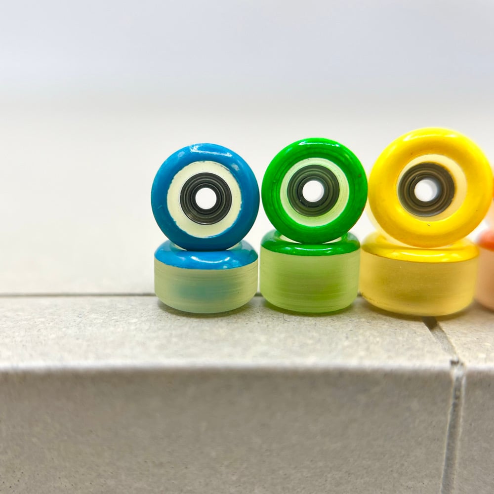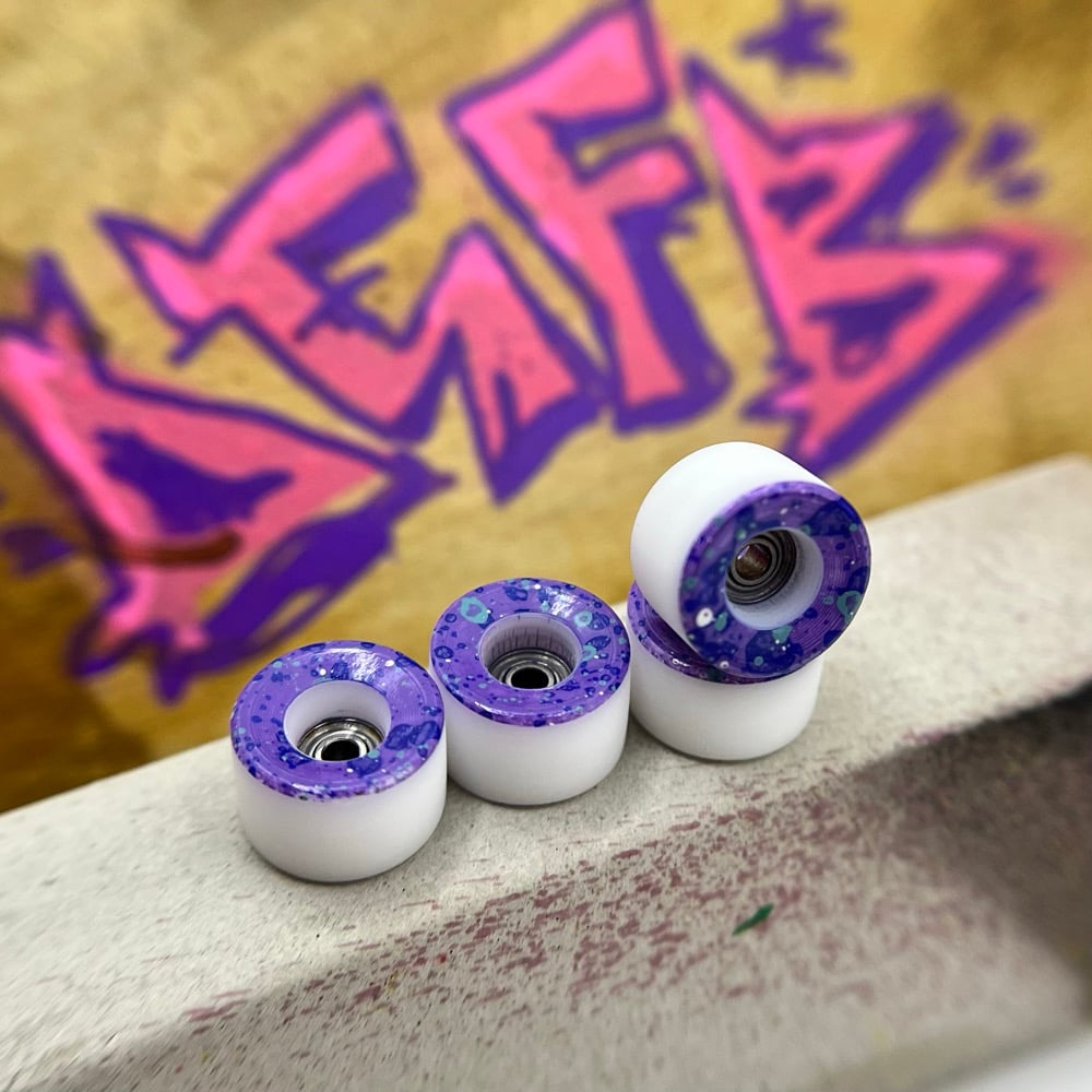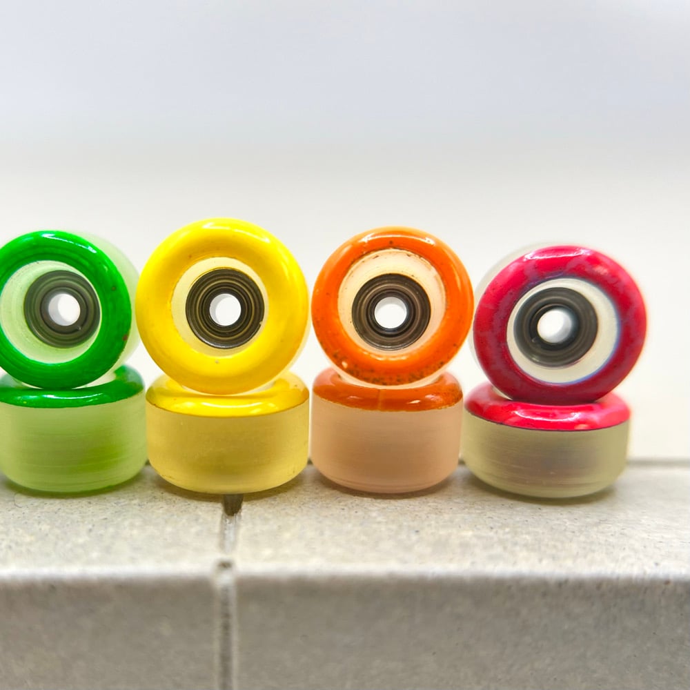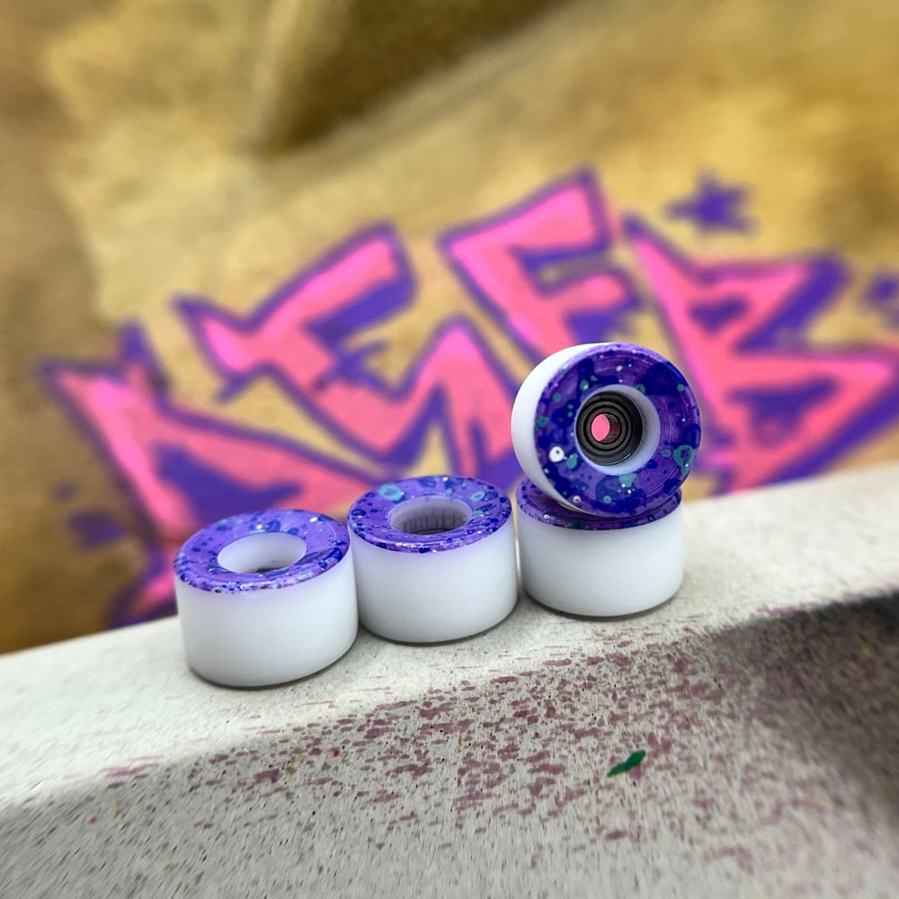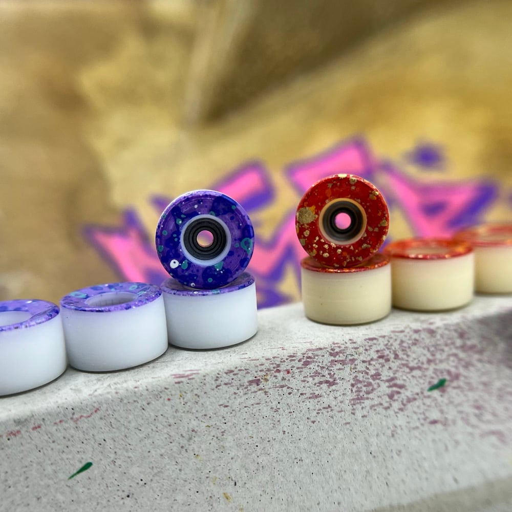 The F2 material is 70D and represent a more classic "hard urethane" wheel. For those who started fingerboarding on plastic wheels and like a hard board feel with a bit more freedom to revert and power slide, these wheels were made with you in mind.