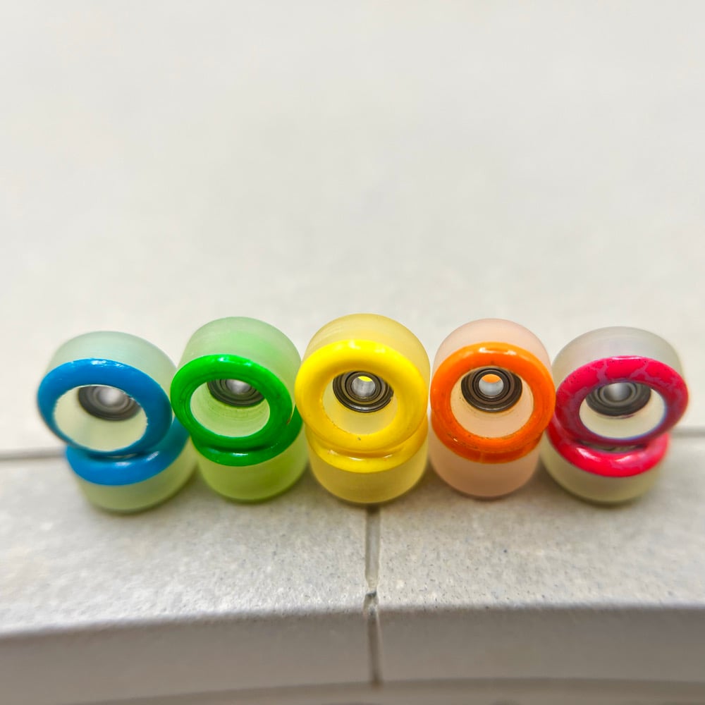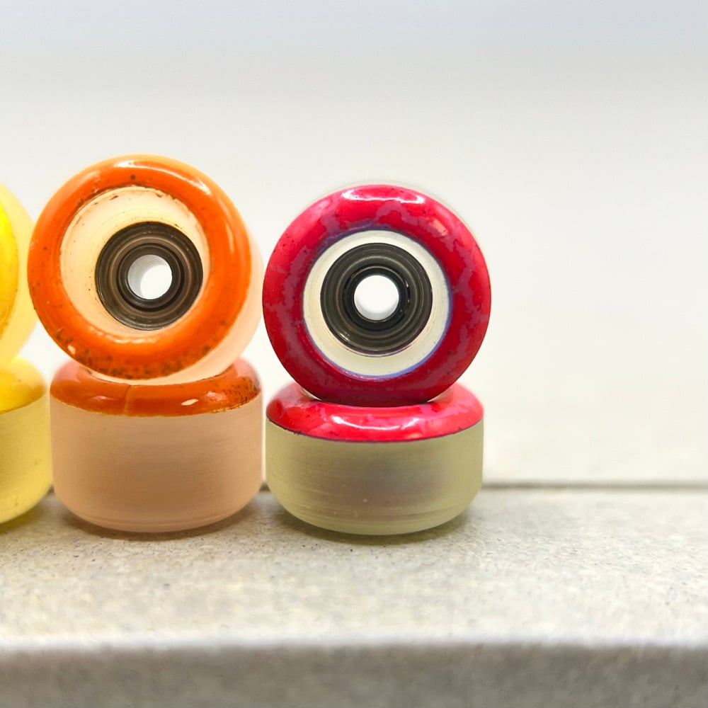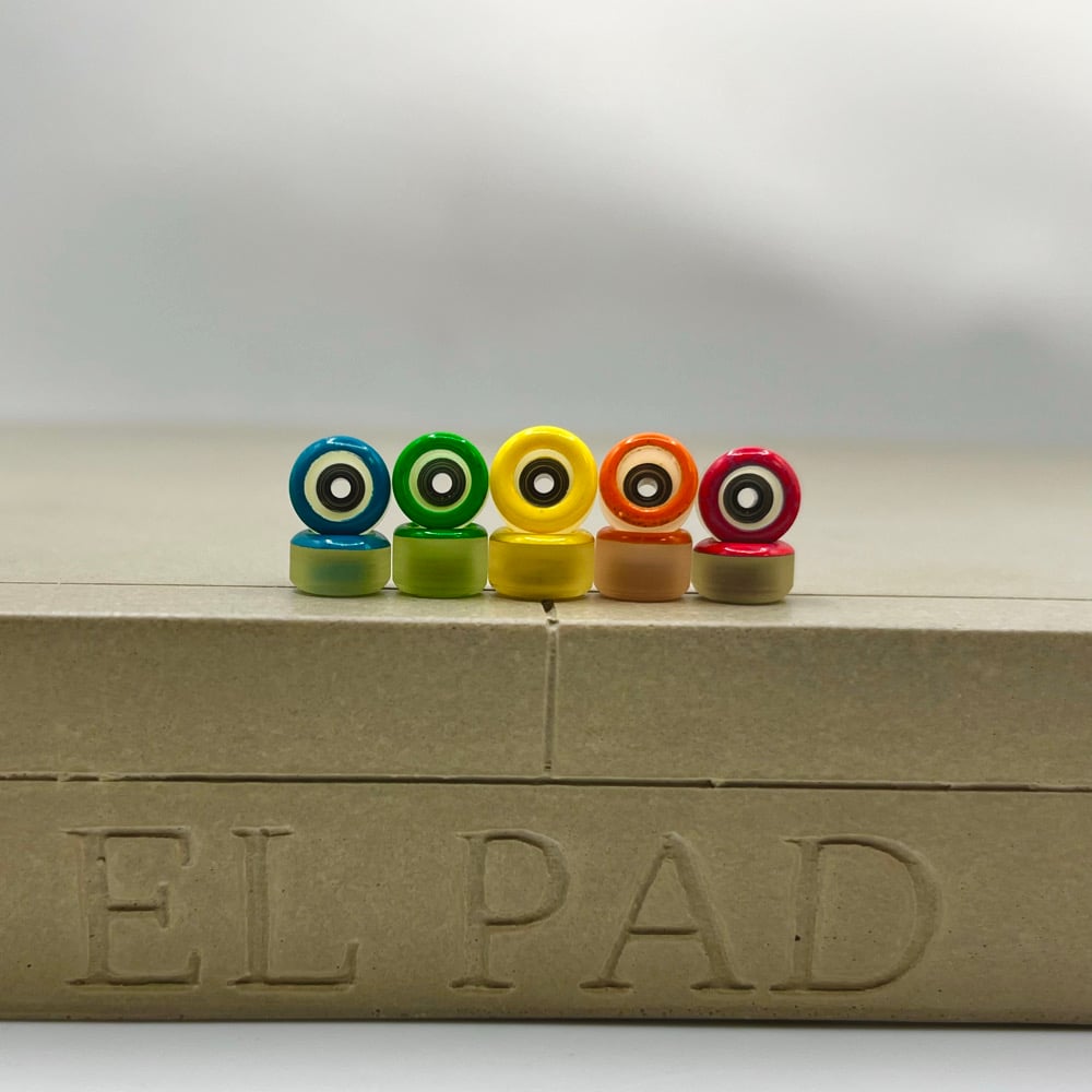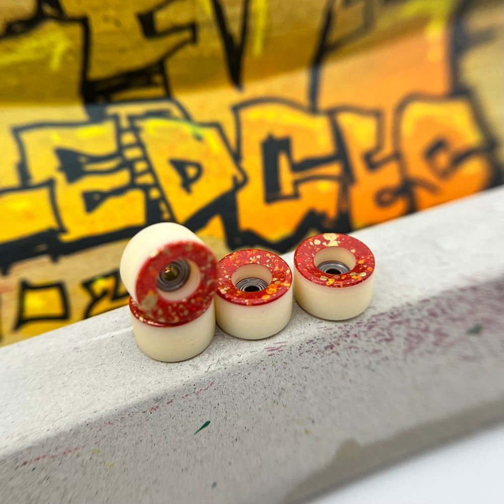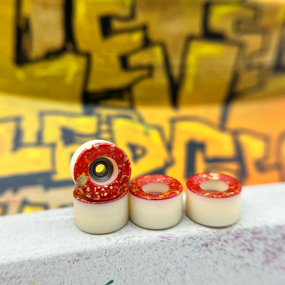 The F2 material is 70D and represent a more classic "hard urethane" wheel. For those who started fingerboarding on plastic wheels and like a hard board feel with a bit more freedom to revert and power slide, these wheels were made with you in mind.