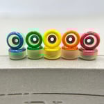 Graffiti painted graphic wheels by Seth. These are are a new experiment and will wear with use. These are custom painted faces on a semi crystal aged butter F2 colorway which was never released.